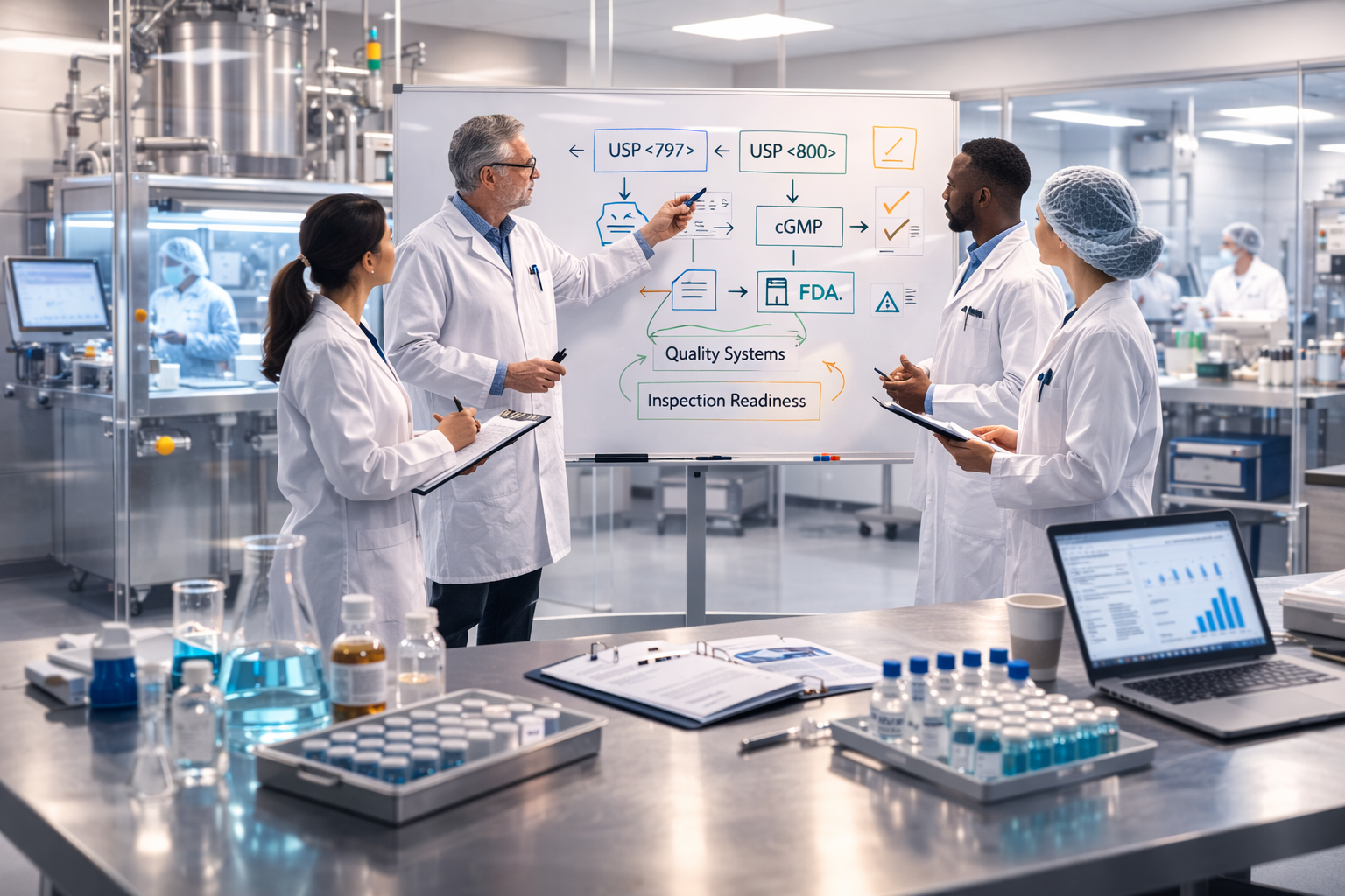 503B facilities are FDA-registered and subject to current Good Manufacturing Practices (cGMP) — the same standards all FDA-registered drug manufacturers must follow. cGMP requirements are vastly different from USP guidance, though there is some overlap in specific areas. They are significantly more in-depth and complex, which is why 503B audits require more time and demand auditors with pharmaceutical industry or FDA regulatory experience.