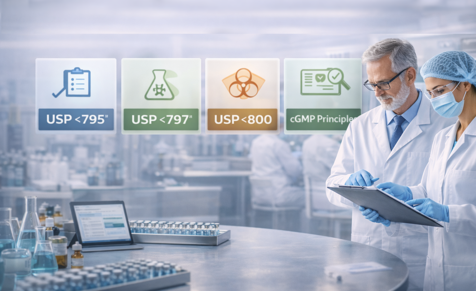 Sterile compounding requirements addressing aseptic technique, environmental monitoring, and contamination prevention.